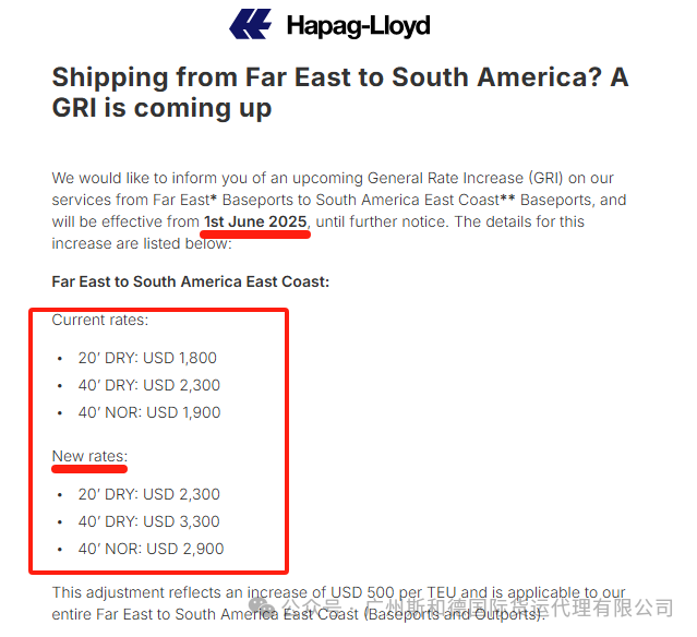 Ο Hapag-Lloyd ανακοίνωσε ότι θα αυξήσει το GRI από την Άπω Ανατολή προς την Ανατολική Νότια Αμερική από την 1η Ιουνίου 2025 μέχρι την επόμενη ειδοποίηση.